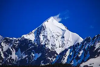 Hearth Mountain is located 12 miles (19 km) northeast of Seward in the Kenai Mountains, on land managed by Chugach National Forest.[1] Precipitation runoff and glacial meltwater from the mountain's slopes drains to Kenai Lake via the Snow River. Although modest in elevation, topographic relief is significant as the summit rises 5,380 feet (1,640 m) above the South Fork Snow River in 2 miles (3.2 km). The mountain is visible from the Seward Highway. The mountain's name "hearth" was applied by mountaineer Vin Hoeman in the 1960s and follows a "fireplace" naming theme for landforms in the immediate area.[2][3] Other fireplace-related landforms nearby include Kindling Mountain, North Andiron, Fireside Glacier, and Hearth Glacier.[3] The mountain's toponym has not been officially adopted by the United States Board on Geographic Names.