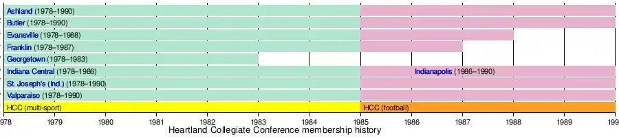 The HCC had eight founding members. Five were from the final lineup of the ICC: Butler University, the University of Evansville, Valparaiso University, St. Joseph's College, and Indiana Central (which became the University of Indianapolis in 1986). They were joined by Franklin College (IN) and Georgetown College (KY), both long-time members of the National Association of Intercollegiate Athletics (NAIA), and Ashland College (today Ashland University), which had played in Division III since the recent reorganization of the NCAA. A ninth institution, the University of Dayton, was involved in preliminary discussions in April 1978 but chose not to join the conference.[1]