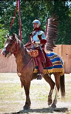 Heavy cavalry was a class of cavalry intended to deliver a battlefield charge and also to act as a tactical reserve; they are also often termed shock cavalry.[1] Although their equipment differed greatly depending on the region and historical period, heavy cavalry were generally mounted on large powerful warhorses, wore body armor, and armed with either lances, swords, maces, flails (disputed), battle axes, or war hammers; their mounts may also have been protected by barding. They were distinct from light cavalry, who were intended for raiding, reconnaissance, screening, skirmishing, patrolling, and tactical communications.[2]