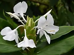 Other common names include butterfly lily, Khumpui, fragrant garland flower, Indian garland flower, white butterfly ginger lily, and white ginger.[5]