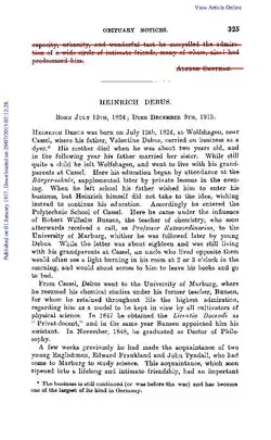 - t., T. E. (1916). "Prof. H. Debus, F.R.S" (PDF). Nature. 96 (196): 515–516. Bibcode:1916Natur..96..515T. doi:10.1038/096515a0.