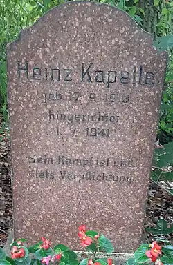 He was arrested many times, but in the end, he and five other group members were arrested by the Gestapo on 16 October 1939. Kapelle was tortured, but never betrayed the other members of his group. The Volksgerichtshof sentenced Heinz Kapelle to death on 21 February 1941 for "furthering the enemy's cause and conspiracy to commit high treason". On 1 July of that year, he was put to death at Plötzensee Prison in Berlin.[1] He is honoured today as a hero by the Communist Youth Movement. A street in the Berlin neighbourhood Prenzlauer Berg is named Heinz-Kapelle-Straße in his honour. Also there is a street close to German Parliament in the very center of Berlin honouring him named Kapelle-Ufer (which loosely translates to "Kapelle Bank" or "Kapelle Shore").[2]