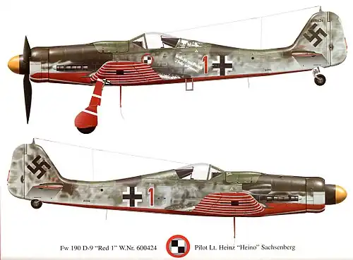 In 1945, he transferred briefly to jet fighters in Jagdgeschwader 7 (JG 7—7th Fighter Wing) as Staffelkapitän (squadron leader) of 9. Staffel of JG 7, but in April 1945 he joined Jagdverband 44 (JV 44—44th Fighter Detachment) based at Munich-Riem. His task was to provide top cover for the Messerschmitt Me 262 jet fighters during takeoff and landing.[12] Sachsenberg was assigned as Staffelkapitän of the Platzschutzstaffel or airfield-protection squadron, flying the Focke-Wulf Fw 190 D-9 fighter. As squadron commander, his particular aircraft was known as "Red 1". The inscription on his Fw 190 D-9 was "Verkaaft's mei Gwand I foahr in Himmel!" meaning "Sell my clothes I'm going to heaven" in a Bavarian dialect.[13] The Me 262 jet was vulnerable to strafing attacks during takeoff and landing. Generalleutnant Adolf Galland, the commanding officer of JV 44, ordered the formation of the Platzschutzstaffel. Already in 1944, III. Gruppe of Jagdgeschwader 54 (JG 54—54th Fighter Wing), flying the Fw 190 D, had provided fighter protection to Kommando Nowotny, the first experimental Me 262 jet fighter unit.[14]