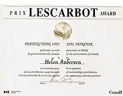 Andersen received a 1992 Lescarbot Award from the Government of Canada, recognizing outstanding contributions to community cultural activities.[2] These included promotion of other artists by mounting group shows, lecturing and demonstrating techniques on television and teaching in her own studio. She served twice as Secretary of the Federation of Canadian Artists; was a member of the Saanich Peninsula Art and Crafts Society; and Board Member of the Community Arts Council (1992).[2]