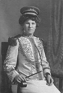 In 1904, Butler's band played at the St. Louis World's Fair alongside many other bands, including that of John Philip Sousa.[2] It was because of her similarly forceful personality that she was given the moniker "The female Sousa".[2] In St. Louis, C.G. Conn—whose instruments Butler had previously endorsed—gave the entire band silver Conn instruments.[2][5]