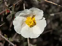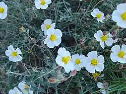 Helianthemum almeriense, also known as jarilla, mata turmera or tormera in Spanish, is a very branched woody plant of the Cistaceae family, with showy white flowers, which blooms in winter and spring.