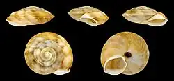 The shell of this species is approximately 20 mm in maximum dimension. The periphery of the shell is sharply keeled. There is a wide umbilicus. The peristome around the aperture is white and strongly reflected and lipped. The shell color is grey-brown with some red brown patches.