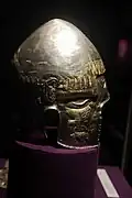 The Helmet of Peretu (Romanian: Coiful de la Peretu) is a Geto-Dacian silver helmet dating from the 4th century BC, housed in the National Museum of Romanian History, Bucharest.[1] It comes from the Peretu area, in the Teleorman County, Romania.[2] There were 57 artifacts made of silver and bronze weighing in total 2585g.[3] The helmet is similar to the Helmet of Coţofeneşti and other three Getian gold or silver helmets discovered so far.[4]
