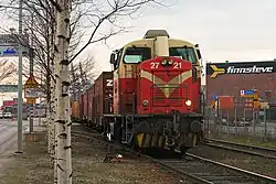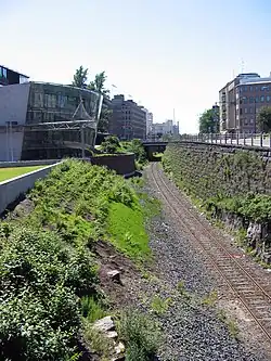 The Helsinki harbour rail line (Finnish: Helsingin satamarata) was a side rail track in Helsinki, Finland, built in the 1890s, and dismantled in 2009. Originally it led from the Helsinki Central railway station, via the city's coastline, to Katajanokka. Its original length was 7 kilometres (4.3 mi), but in its final stage, its length was only about 3 kilometres (1.9 mi). In the final phase the track had two level crossings and a rail yard in the Länsisatama (West Harbour). Near the start of the track were the former VR warehouses. It was used only by trains going to the harbour and Hietalahti shipyard, but special request trains have also travelled the track.