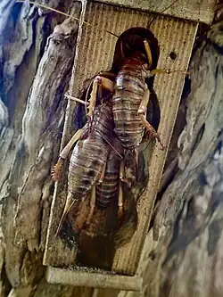 Hemideina ricta live in cavities in trees, wooden posts, crevices, rocks, fallen tree logs, or the ground.[7] Some of the tree species it may occupy include lacebark, kanuka, broadleaf, mahoe and five finger.[5] Hemideina ricta generally does not dig its own cavities, instead occupying those previously made by the larvae of other insects,[8] preferably those with a small opening (wide enough for its head to fit through) with a large space inside.[7] There can be several wētā living in a single cavity at any one time, often a single male with several females.