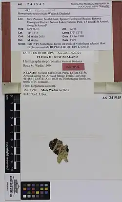 - ^ a b c Diederich, P.; Wedin, M. (2000). "The species of Hemigrapha (lichenicolous Ascomycetes, Dothideales) on Peltigerales". Nordic Journal of Botany. 20 (2): 203–214. Bibcode:2000NorJB..20..203D. doi:10.1111/j.1756-1051.2000.tb01571.x.