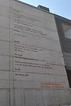 Marsman's poem "Berlijn" is painted on an exterior wall of the Dutch Embassy in Berlin,[16] both in the original Dutch and in German translation (a further English translation is supplied below):