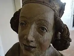 His works are often confusingly similar to those of Notke, and scholars debate about what works should be assigned to which artist. As a rule, however, van der Heide seem to have added more individuality to his portraits and less emotionally overstated.[4] Works attributable to van der Heide include altarpieces in Brændekilde church, Denmark[5] and in Saaremaa Museum, Estonia (previously in Kaarma church);[6] the Saint George and the Dragon group currently in the St. Anne's Museum, Lübeck;[2][4] a sculpture of St. Jerome in Vadstena Abbey, Sweden;[4] a sculpted head of St. John the Baptist currently in the Swedish Museum of National Antiquities,[7] and others.