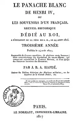 That same year, 1816, Jean-Baptiste Augustin Hapdé, a former Empire thurifer who had rallied to the Bourbons, published a work with an eloquent title: Le Panache blanc de Henri IV, ou les Souvenirs d'un Français.[42] The following year, the king's gesture of displaying his plume at the head of his troops before the battle was used in an illustration by Alexandre-Joseph Desenne for a reprint of La Henriade.[43][44]