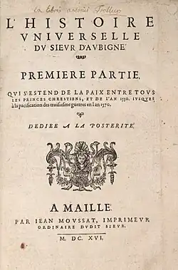 Huguenot warrior and writer Théodore Agrippa d'Aubigné offers a literary version of the royal formula in his Histoire universelle (right, title page of an original edition, 1616).