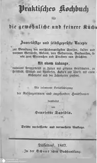 From 1841 to 1848 Davidis worked at Haus Heine in Sprockhövel as a teacher at a free, so-called "working school". During that time her Praktisches Kochbuch. Zuverlässige und selbstgeprüfte Recepte der gewöhnlichen und feineren Küche (Practical Cookbook. Reliable and self-tested Recipes for the ordinary and refined Kitchen) was published, followed in 1847 and 1848 by Arrangements zu kleinen und größeren Gesellschaften and Praktische Anweisung zur Bereitung des Roßfleisches (Arrangements for smaller and larger parties/Practical instruction for the preparation of horse meat), both later merged into Praktisches Kochbuch. For Praktisches Kochbuch Davidis had been doing substantial research and collected recipes for a long time.
