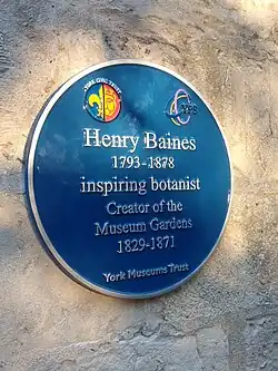 In November 2018 a blue plaque commemorating Henry Baines was erected on the side of Manor Cottage, where Baines lived with his family from 1844. The plaque, dedicated by the Yorkshire Philosophical Society, York Civic Trust and York Museums Trust reads: "Henry Baines, 1793โ1878, inspiring botanist. Creator of the Museum Gardens 1829โ1871."