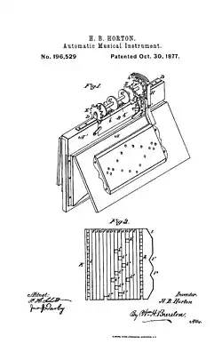 Around 1823, his family moved to Covert, New York, where he grew up. When Horton was 19 years old, he served for three years as a cabinet maker's apprentice under George Whiton (1801–1878).[2] After this, he became involved in the manufacture of melopeans, instruments similar to melodeons. His taste for music showed itself at an early age and during his lifetime he invented various musical instruments, most celebrated being the organette. His first patents for the instrument were granted in 1877 and 1878, and these were followed by a device for cutting the slots in the paper rolls used in the organette. A company to manufacture this instrument was founded in 1879, where he served as its president until his retirement in 1883.