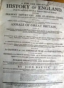 Following his release from Newgate in 1796, Symonds continued publishing and in 1799 issued a 13-page catalogue of New books printed for H. D. Symonds, No. 20, Paternoster-Row. 1799.[17] Other noteworthy publications included the second edition of Sampson Perry, An historical sketch of the French Revolution commencing with its predisposing causes, and John Baxter's 830 page A new and impartial history of England, which included engraved portraits of several of the radicals.
