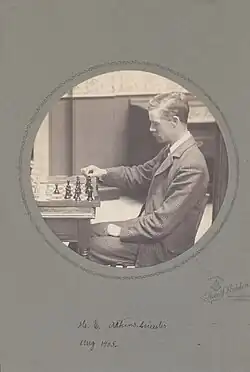 Between 1895 and 1901, Atkins played in seven minor tournaments, winning four and finishing second or equal second in the others, and losing just 3 out of 70 games.[10] These included the minor tournament at the great Hastings 1895 tournament, where he finished equal second, behind Géza Maróczy, and was awarded the Newnes Cup for the best result by a British amateur.[11][12][13] At Bristol 1896, he yielded just one draw in nine games.[14][15] At Southampton 1897, the Eighth British Amateur Championship, he scored an undefeated 8.5 points out of 10 possible, retaining his British amateur title.[16][17] At Craigside 1899, he scored 7.5/10, behind Amos Burn (9/10). At Amsterdam 1899, an amateur tournament that was Atkins' first international appearance, he achieved a rare perfect score, winning all 15 games and finishing 4 points ahead of the second-place finisher.[18][19][20] He scored 4/6, again finishing behind Burn (5/6), at Birmingham 1899.[21] At Bath 1900, he scored 12.5/14, yielding just 3 draws in 14 games.[22] At Llandudno 1901, a four-man double-round robin, Atkins was again bested by Burn, who scored 4.5/6 to Atkins' 3.5 points.[23] Between 1896 and 1911, Atkins participated in the annual 10-board cable match between Britain and the United States every year except 1909.[24]