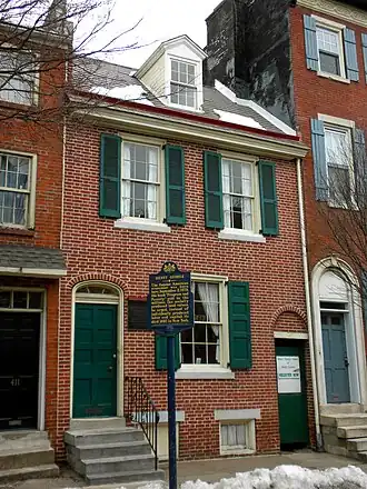 Built in 1801, this historic structure is a three-story brick rowhouse, which was designed in a late Federal style. The layout is typical of a Philadelphia rowhouse with a "front building" and "back building." It also has a "piazza."[2]