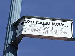 Among other honors a promenade along the city's historic bayfront Embarcadero was christened "Herb Caen Way..." [35]—a reference to what Caen called his "three-dot journalism" for the ellipses separating his column's short items.[36] This was particularly appropriate given the recent demolition of an eyesore against which Caen had long campaigned: the elevated Embarcadero Freeway, built astride the Embarcadero forty years earlier and derided by Caen as "The Dambarcadero." [37] A tribute was inserted in the Congressional Record.[38]