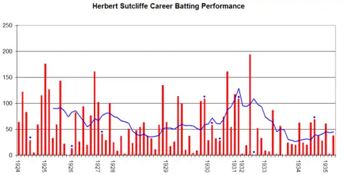 In 1930, Sutcliffe was the leading Englishman in the first-class batting averages behind Don Bradman (i.e., of batsmen with 10 completed innings).[53] In a summer of hot, thundery weather that produced some exceptionally bad pitches, Sutcliffe averaged 87.61 in the four Tests he played in, scoring 161 in the Fifth Test at the Oval.[54] Sutcliffe's first-class aggregate in 1930 was 2,312 runs at 64.22 with 6 centuries and a highest score of 173 against Sussex.[16]