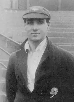 Sutcliffe kept his place in the Yorkshire team and continued to bat in the middle of the order for a month until, in the match against Nottinghamshire at Bramall Lane on 27 and 28 June, Wilfred Rhodes decided to drop down the order for the 2nd innings and Sutcliffe went in first with Percy Holmes.[12] After some indifferent scores, he completed his maiden first-class century on 23 and 24 July against Northamptonshire at Northampton when he and Holmes put on 279 for the first wicket, Sutcliffe scoring 145 and Holmes 133.[13] Further success resulted in Holmes and Sutcliffe being awarded their county caps in August 1919.[14] Sutcliffe created a debut season record[15] by scoring 1,839 runs at an average of 44.85 with 5 centuries and a highest score of 174 against Kent at Crabble Athletic Ground in Dover.[16] Holmes and Sutcliffe scored 5 centuries each in 1919 and they shared in 5 century partnerships. Their performances were key to Yorkshire winning the championship that season for the 10th time in all.[14]