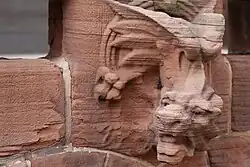 The first floor of the mansion is finished in undressed sandstone, with the exception of the 1919 extension. The rest of the exterior is constructed of Belleville brownstone with a brick terra cotta facing.[8] The entrance is accessed by a broad stone staircase, flanked by two semicircular towers or bays which rise to the height of the third floor where they each form a separate balcony. A third balcony on the second floor runs between the two. Each of the bays features three large bay windows per floor. Above and between the bays, on the third floor, are two semicircular windows, surmounted by a single rectangular window in a gable, which in turn is flanked by two tall chimneys. The roof itself is steeply sloped, gabled and tiled. The bays at the front of the building are echoed by a third, smaller ground floor bay in the center of the building in Henry Street.[9]
