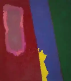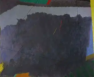 Cherry also spoke of colors engaging with and repelling from each other, being sympathetic or antagonistic and evoking feelings of pleasure or disgust.[16]: 98 One critic saw in the paintings he exhibited in the 1955 solo at the Stable Gallery "a wealth of color and imagery shining forth."[39] Reviewing the 1959 solo at Poindexter, a critic said Cherry had become a "sure colorist" who "pushes apart colors that the eye tries to draw together".[42] Another said of the paintings shown in the 1961 solo at Poindexter: "By operating his colors against one another, he can make a canvas dance."[57] This critic believed that Cherry's main concern, however, was "not with color itself, but with energy: sun energy, kinetic energy, hand energy, and spirit energy."[57] Cherry had said something like this in his 1955 essay, writing, simply, "Color is its own light."[16]: 98 In reviewing the 2004 retrospective show at Southampton College, a reviewer felt that Cherry's paintings conveyed "a sense of movement and shifting depth through subtle optical and atmospheric effects".[58] Yet another critic wrote that the paintings of this period comprised a "kinetic record of changing modes of feeling."[59] Elaborating on the concept of motion generated by color forms, a critic reviewing a four-man show at a Woodstock gallery wrote in 1964, "Mr. Cherry's approach to inventing intensely gripping surfaces depends on establishing an emphatic architectonic structure, allowing the motion to be within a controlled but vibrant area."[60] Cherry's painting called "No. 4" of 1958 (Image No. 3) was shown at this time.