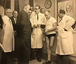 Though severely injured, Wall held onto his 35mm Leica camera. His tenacity very well may have been the thing that kept him alive, along with his khaki uniform sealing his wounds.[5] In the pre-operative tent, Wall spoke with the medical officer, Captain Joseph Aprile, who was attempting to save his life, saying the film from his camera needed to get back to headquarters. Finally being assured this would happen, he released the film. The Army Pictorial Service in London received, processed and distributed these photos, the greatest number of pictures released by a single photographer on D-Day.[6][7][8]