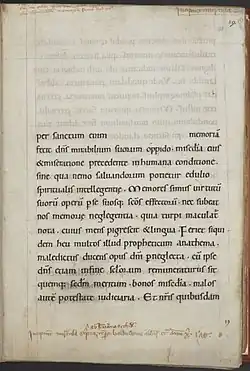 Herman may have written the first half, covering the period up to the Conquest, around 1070, but it is more likely that the whole work was written in the reign of King William II (1087–1100).[27] Herman's original text in his own hand does not survive, but a shorter version[b] forms part of a book which covers the official biography of the abbey's patron saint. As Herman clearly intended, the book is composed of Abbo's Life followed by the Miracles. It is a luxury product dating to around 1100.[29] This version has some blank spaces and the final miracle stops in the middle of a sentence, indicating that the copying ceased abruptly. A manuscript dating to 1377 includes seven miracles assigned by the scribe to Herman which are not in the Miracles, and they are probably the stories which were intended for the blank spaces.[30][c] Two copies survive of a version produced shortly after Herman's death which leaves out the historical sections and only includes the miracles.[32][d]