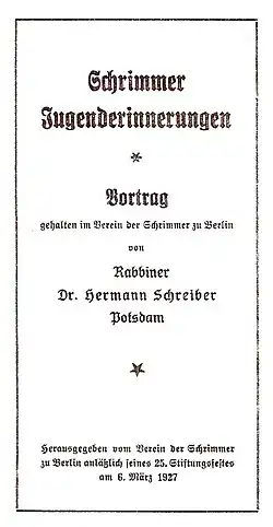 On 6 March 1927, on the occasion of the 25th anniversary of the Association of Schrimmers, Hermann Schreiber delivered a lecture, which was later published in print as Schrimmer Jugenderinnerungen (Schrimm – Memories from Our Youth'). The memories are a valuable source for research on the history of Jews in the Province of Posen. Schreiber describes in the memories the daily life of his own family and other Jews living in Śrem, Jewish traditions, customs and festivals, but also the daily life of ethnic Poles and ethnic Germans who lived in Śrem. The memories were translated into English.[2] In 2008 the memories were also translated into Polish and published by Krzysztof Budzyń in the journal "Śremski Notatnik Historyczny" (Śrem Historical Notebook).[3]