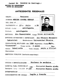 Hernán Merino Correa was born in Antofagasta, on July 17, 1936, in northern Chile. He was the son of Captain of Carabineros Carlos Merino Charpentier, and Ana Correa de la Fuente. He was the second of four brothers, of whom he and Carlos chose to follow the family tradition of being part of the Carabineros.[1]