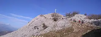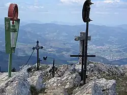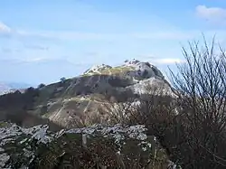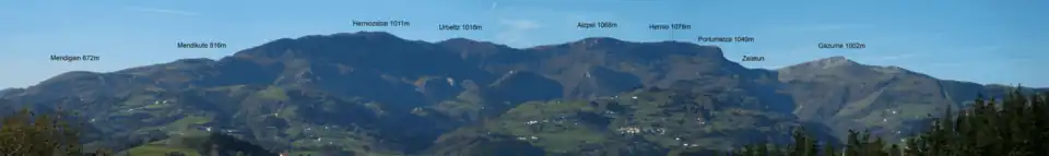 Hernio (Basque pronunciation: [erˈniˌo]; also spelled Ernio) is an iconic summit in the Basque Country very popular with the Gipuzkoans and located right at the heart of the province. The peak is the highest point of a massif extending north-west to south-east, the summit rising by the pass of Zelatun. Neighbouring summits lined up NW to SE at the range are mount Gazume (997 m) standing west across the summit and mount Herniozabal (1,200 m) closing the range east at the rear. The villages lying at the feet of the mount are Errezil (SW), Alkiza (NE) and Asteasu (N). The summit of Hernio affords to the NW a beautiful view over Azpeitia and the stone bulk of Izarraitz towering over the town.