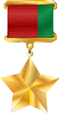 The recipient of the title is given a medal called the Medal of the Hero of Belarus (Belarusian: медаль Героя Беларусі, Russian: медаль Героя Беларуси). The star and suspension are made of gold, and thus it is nicknamed "Gold Star", as was its predecessor, the Hero of the Soviet Union. The star has a total diameter of 33 millimeters, and is attached to a rectangular suspension device (boot tree). In the center of the rectangle is a ribbon of two sections of red and one section of green. The red and green bars on the ribbon evoke the design and colors of the national flag. The amount of gold is set at 585–1 Test, with the total weight of the medal being 19 grams.[7] The present design was enacted into law by Presidential Decree Number 516 on September 6, 1999.[8]