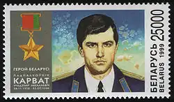 The medal was featured on a stamp, released by Belposhta, commemorating the 3rd year of Karvat's death. Designed by V. Volynets, the 25,000 rouble stamp featured the medal on the left and Karvat's photo on the right in full color. In the white text below the medal, it says "Hero of Belarus, Uładzimir Mikalaevič Karvat, (28.11.1958 – 23.05.1996)". It was issued on August 12, 1999, and had a print run of 90,000.[23]