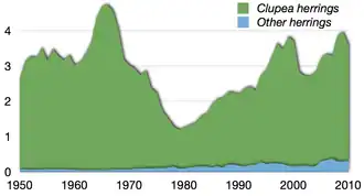 Herring played an important role in the history of marine fisheries in Europe,[2] and early in the 20th century, their study was fundamental to the development of fisheries science.[3][4] These oily fish[5] also have a long history as an important food fish, and are often salted, smoked, or pickled.