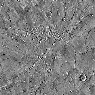 Tyrrhenus Mons (Tyrrhena Patera) is an eroded, low-lying volcano in the western part of Hesperia Planum. It is one of the oldest large central-vent volcanoes on the planet[27] and a member of a class of volcanoes called highland paterae, which erupted mainly in the Late Noachian and Early Hesperian.[28] Tyrrhenus Mons stands only 1.5 km above the surrounding plains. At its center lies a 40 km diameter depression, or caldera, from which radiate numerous flat-floored valleys and ridges that suggest the volcano has been highly eroded. The low relief of Tyrrhenus Mons combined with its degraded state indicate the volcano consists largely of friable and easily eroded material such as volcanic ash. The ash was likely derived from the interaction of magma with groundwater or ice.[29]