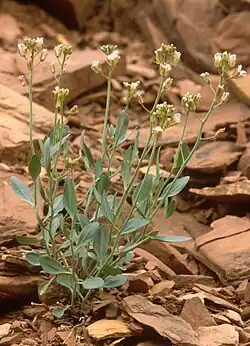 This is a perennial herb with multiple erect stems growing 10 to 38 centimeters tall from a caudex. The leaves are oblong or oval in shape with smooth or slightly toothed edges, the blades measuring up to 5 centimeters in length. The inflorescence is a raceme of mustardlike flowers. Each flower has green or purple sepals and four white or pale purple petals with purple veining, each petal measuring about a centimeter long. The fruit is a curved silique roughly 2 to 5 centimeters long.[3]