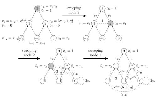 The algorithm's input is the computational graph of the function. After a preceding forward sweep where all intermediate values in the computational graph are calculated, the algorithm initiates a reverse sweep of the graph. Upon encountering a node that has a corresponding nonlinear elemental function, a new nonlinear edge is created between the node's predecessors indicating there is nonlinear interaction between them. See the example figure on the right. Appended to this nonlinear edge is an edge weight that is the second-order partial derivative of the nonlinear node in relation to its predecessors. This nonlinear edge is subsequently pushed down to further predecessors in such a way that when it reaches the independent nodes, its edge weight is the second-order partial derivative of the two independent nodes it connects.[2]