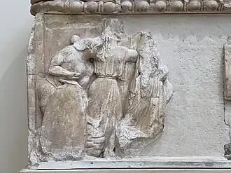 Traditionally, Hestia is absent from ancient depictions of the Gigantomachy as she is the one who must keep the home fires burning when the other gods are away.[16] Nevertheless, her possible participation in the fight against the Giants is evidenced from an inscription on the northern frieze of the Siphnian Treasury in Delphi; Brinkmann (1985) suggests that the letter tracings of one of the two goddesses right next to Hephaestus be restored as "Hestia", although other possible candidates include Demeter and Persephone, or two of the three Fates.[17][18]