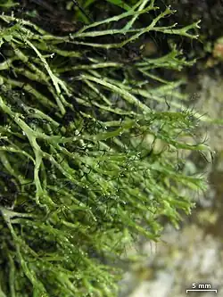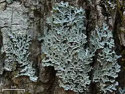 Heterodermia is a genus of foliose lichens in the family Physciaceae.[2] The genus has a widespread distribution, especially in tropical regions, and contains about 70 species. Heterodermia was historically confused with the related genus Anaptychia, but was distinguished in 1965 based on differences in spore structure and chemical composition. These lichens can be identified in the field using simple chemical spot tests that produce distinctive colour changes when applied to the thallus. The lichens in this genus are small- to medium-sized, usually pale grey in colour, comprising narrow lobes with widened tips fringed with cilia. The lichens can be identified by their thick-walled ascospores and the presence of specific chemical compounds (lichen products) that produce colour reactions when spot tested. Most species are found in tropical and subtropical regions around the world, commonly growing on tree bark in mountain forests. Heterodermia species support a rich community of specialized parasitic fungi, with over 20 different species known to grow specifically on these lichens. Some species have traditional uses in medicine and cooking, particularly in India, Nepal, and Brazil.