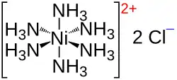Hexaamminenickel chloride is the chemical compound with the formula [Ni(NH3)6]Cl2. It is the chloride salt of the metal ammine complex [Ni(NH3)6]2+. The cation features six ammonia (called ammines in coordination chemistry) ligands attached to the nickel(II) ion.[1]