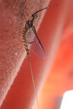 When the fully developed nymph rises to the surface to emerge as an adult, it first enters a subimago stage. This is similar in appearance to the adult, but has cloudy rather than clear wings and lacks functional genitalia.[3] After a period of one to three days, the subimago flies to a resting place where it molts one more time, becoming a sexually mature adult form, the imago.[5]