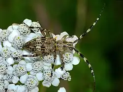 The squeaking longhorn is so called for the noise it makes, by stridulation, when handled. Female beetles lay an egg under the bark of dead or dying trees, especially Pinus radiata or New Zealand beech (Nothofagus).[5] These hatch in 10–19 days, and larvae live under, and feed off, wood for perhaps two or three years.[5] They pupate for 30 days, hatching from spring to autumn (August to April) into adult beetles which live for up to three months.[6] Adults are reluctant fliers.[5]