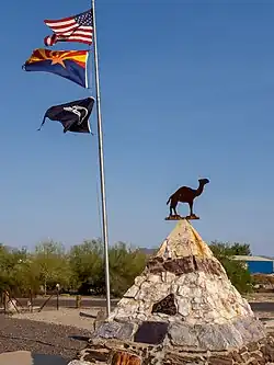 The Hi Jolly Monument in July 2025, with flags of the United States and Arizona, and the POW/MIA flag—as seen from behind.