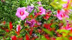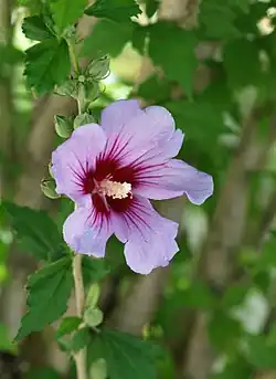 Hibiscus syriacus is a species of flowering plant in the mallow family, Malvaceae. It is native to areas of east Asia, but widely introduced elsewhere, including much of Europe and North America. It was given the epithet syriacus because it had been collected from gardens in Syria.[3][4][5] Common names include the rose of Sharon[6] (especially in North America), Syrian ketmia,[7] shrub althea[8] (or simply althea[9][10]), Korean Hibiscus and rose mallow (in the United Kingdom). It is the national flower of South Korea and is mentioned in the South Korean national anthem.[11]