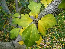 The branches are thin and gray, white-lenticeled, with raised leaf scars and small buds. Stems and branches do not branch very much unless pruned, resulting in many long, straight stems that originate from about 1.5–4 cm (0.5–1.5 inches) above the ground, giving rise to the shrub's overall vase shape.[14] The leaves appear unusually late in the season, in May.[15] They are usually green or yellowish green, alternate, broadly ovate, palmately veined, and 7.5 cm (3 inches) long. They have three distinct lobes with coarsely-toothed margins.