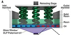 High-area rapid printing (HARP) is a stereolithography (SLA) method that permits the continuous, high-throughput printing of large objects at rapid speeds (Figure 1).[1] This method was introduced in 2019 by the Mirkin Research Group at Northwestern University in order to address drawbacks associated with traditional SLA manufacturing processes. Since the polymerization reactions involved in SLA are highly exothermic processes, the production of objects at high-throughputs is associated with high temperatures that can result in structural defects. HARP addresses this problem by utilizing a solid-liquid slip boundary (Figure 2[1]) that cools the resin by withdrawing heat from the system. This allows for large structures to be fabricated quickly without the temperature-associated defects inherent to other SLA processes.